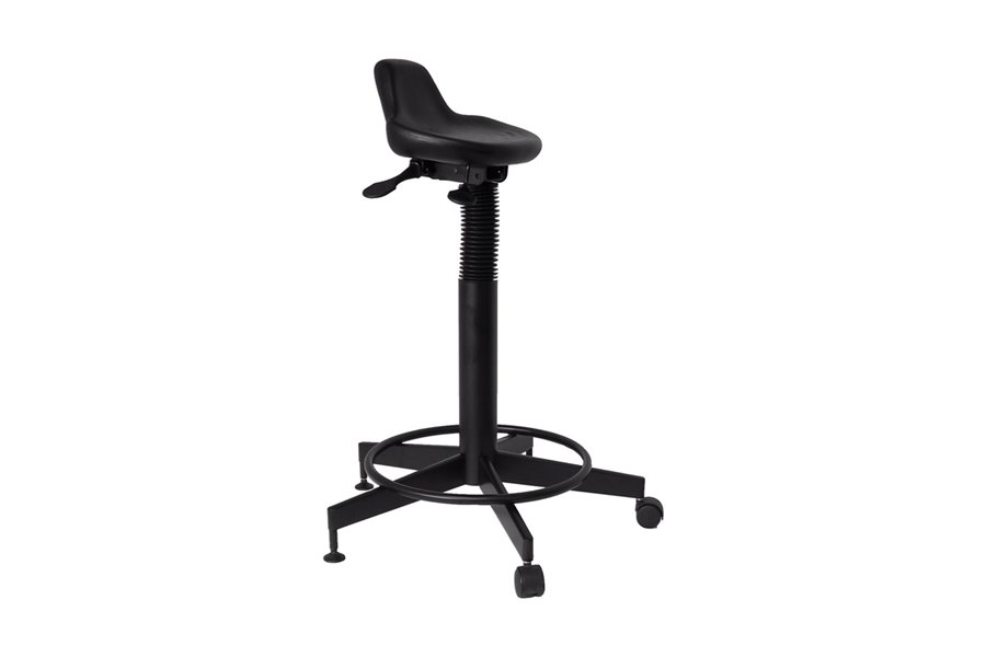 The sit stand seat kit manufactured by Leggett & Platt Work Furniture was developed in response to the demand for ergonomics in the manufacturing environment. It is equipped with infinite tilt lock and a TA lever for pneumatic height adjustment. The seat travels 6° forward and 0° rearward, and the molded foam seat provides a durable surface and some rear support for the occupant. The caster-and-glide combination allows the occupant to sit in the seat securely and provides the versatility of moving the chair without carrying it.
